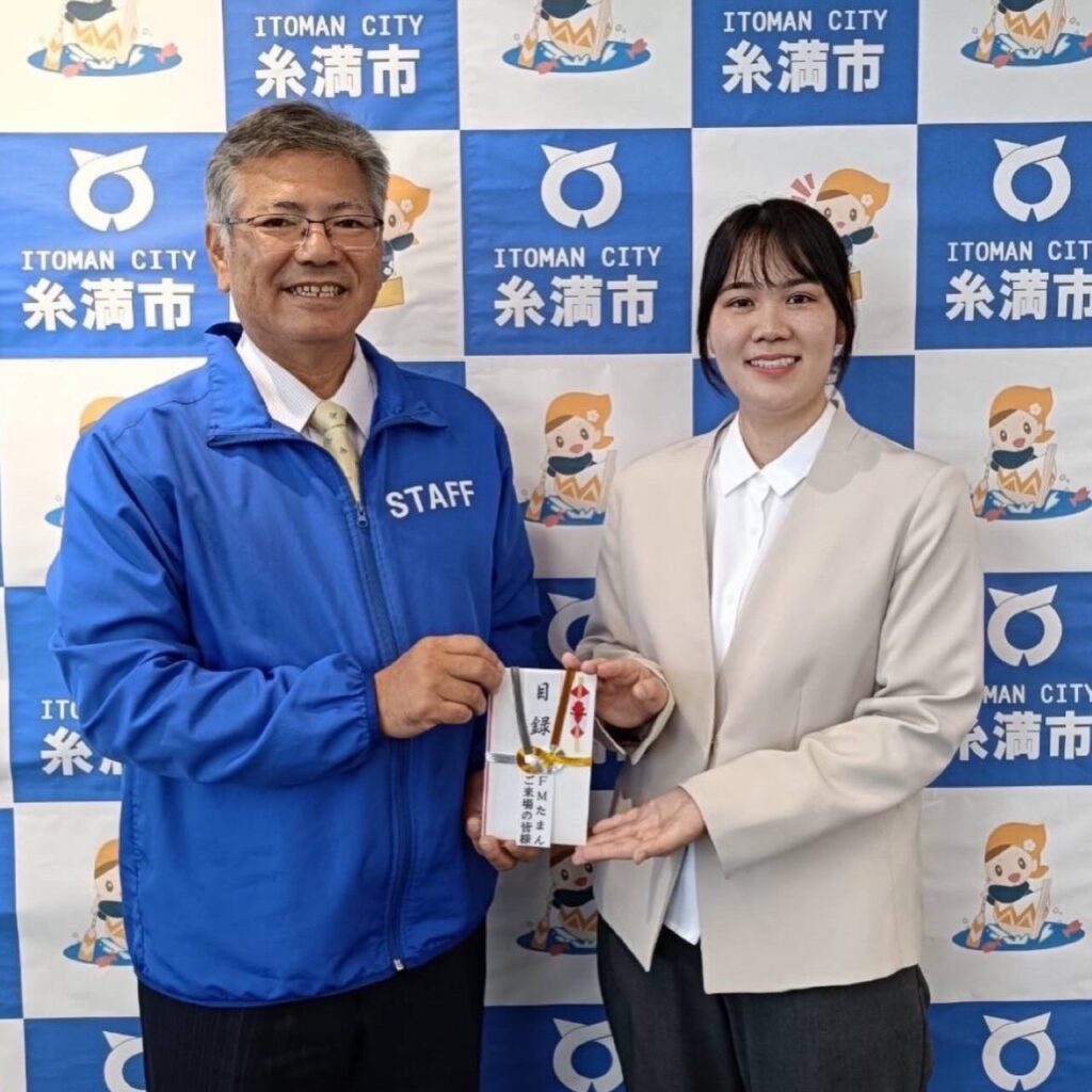 今回の寄付金贈呈は、公共施設であるいとまーるを公開生放送の会場として使わせてもらっている感謝の気持ちを込めて、糸満市の人材育成事業に対して贈呈致しました。