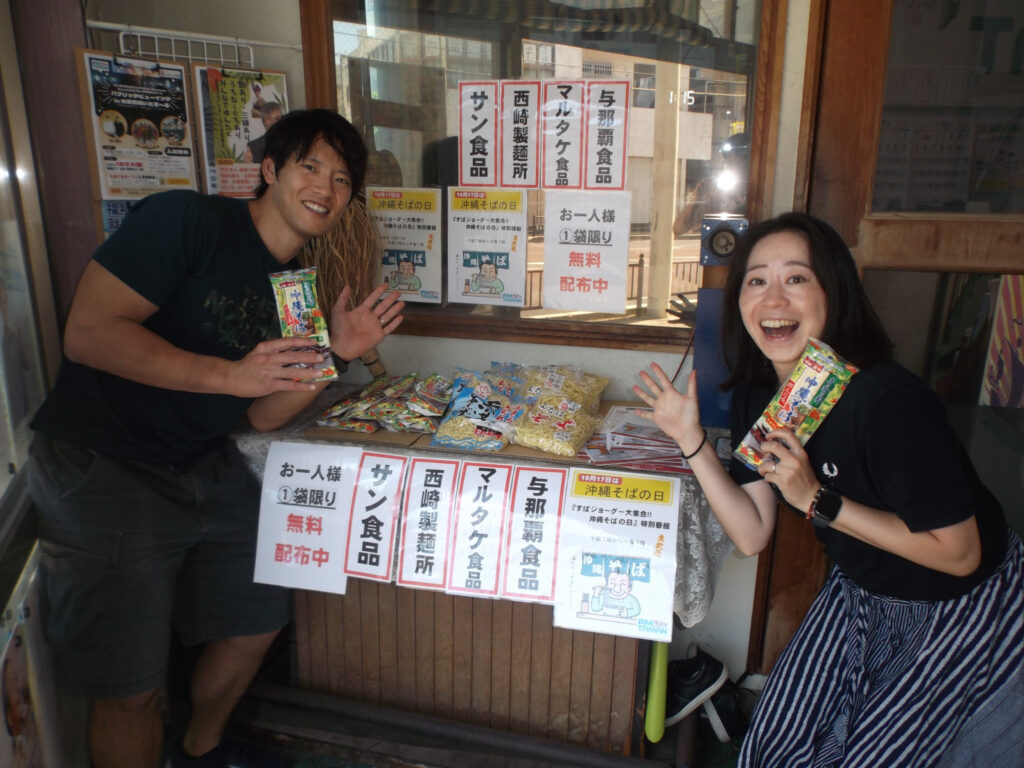 今年もラジオを聞いて駆けつけてくれたリスナーの皆様に250袋(500食分)の沖縄そば麺を配りました!!